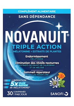 Novanuit de Novasanté, en troisième position, proclame que sa combinaison entièrement naturelle de mélatonine et d'extraits de plantes peut améliorer la qualité du sommeil et raccourcir le délai d'endormissement.