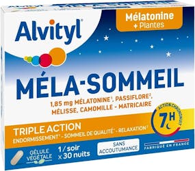 Se classant en 5ème position, Méla-Sommeil d’Alvityl met en avant sa formulation naturelle et végétale, incluant la mélatonine. Cependant, le dosage de celle-ci excède la limite recommandée de 1 mg. Il se distingue par l'intégration de passiflore, de mélisse et de camomille, toutes connues pour leurs vertus relaxantes.